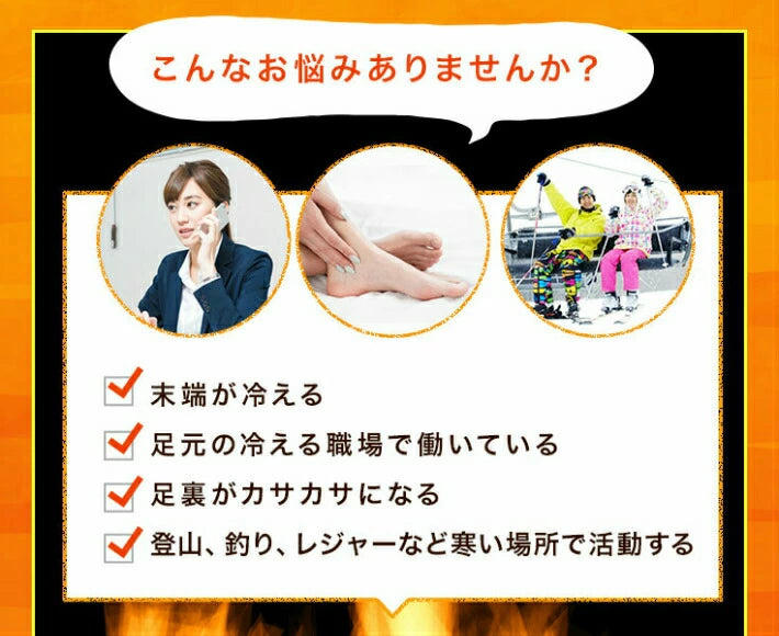 コメント 足がカサカサで保湿が必要な方にも! 登山、釣り、スキー・スノボなど寒いところで活動する方にも! ホットな足元で暖房費も節約♪
